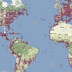 Jonathan suggested a "heatmap" of the Flickr photos would help, so to create this I wrote a script to grab metadata for the photos from the Encyclopedia of Life's Flickr pool, extract latitude and longitude, and draw the resulting locations on a map. I aggregated the points into 1°×1° squares, and generated a GBIF-style map of the photos: