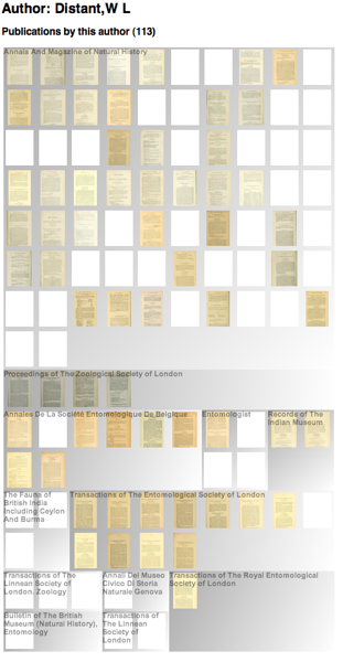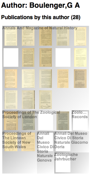 One of these ideas is to use quantum treemaps to display an author's publications. For example, below is a treemap showing publications by G A Boulenger in my Australian Faunal Directory on CouchDB project. The publications are clustered by journal. If a publication has been found in BioStor the treemap displays a thumbnail of that publication, otherwise it shows a white rectangle. At a glance we can see where the gaps are. You can view a publication's details simply by clicking on it.