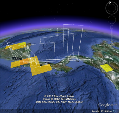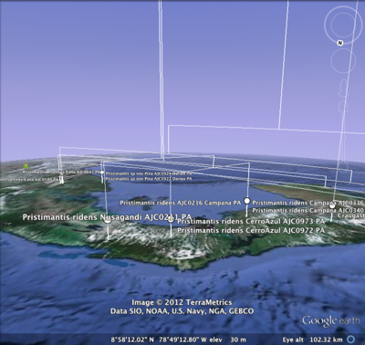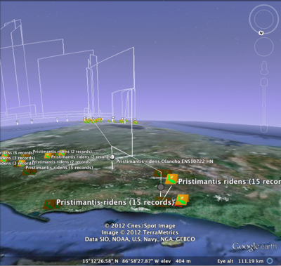 As an example, below is the GBIF 1° density map for the frog Pristimantis ridens from GBIF, with the phylogeny from Wang et al.Phylogeography of the Pygmy Rain Frog (Pristimantis ridens) across the lowland wet forests of isthmian Central Americahttp://dx.doi.org/10.1016/j.ympev.2008.02.021 layered over it. I created the KML tree from the corresponding tree in TreeBASE using the tool I described earlier. You can grab the KML for the tree here.